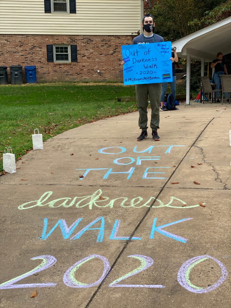 This year, the Out of the Darkness Walk was re-imagined as an Out of the Darkness Experience. There was a live-stream to the event, and we were encouraged to walk in our own communities to spread awareness about suicide prevention and walk proudly for this cause. As we walked through the neighborhood, I felt a little down, but I dug myself out of that hole. Part of what makes these experiences special is seeing hundreds of people come together for the walk. Seeing that many people can be empowering, and for a community that often feels like they are all alone, it is very comforting.